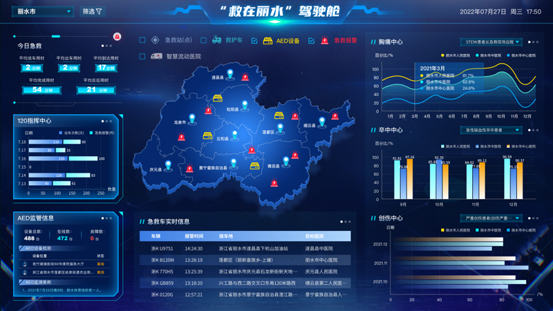 據了解,“救在麗水”駕駛艙正式上線,將急救相關信息和關鍵數據多維度、多角度、多層級展現,實現醫療急救精密智控,一屏全覽。并與高速交警對接,實現資源集中合理調度,突發重大事故救援多部門資源共享及應急聯合處置。同時,該應用集成了麗水市221個醫療機構、127輛救護車、46輛流動醫院、524臺AED設備等資源集體“上云入網”,形成急救資源全景“一張圖”。