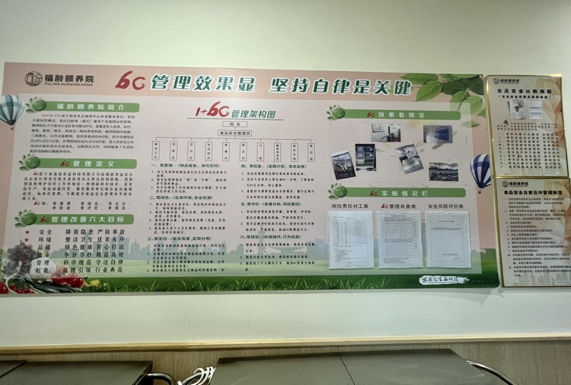 老人和家屬如何知曉每日餐食是否衛生安全?據了解,福齡頤養院建立了食品安全各項制度,推動大宗食品采購規范化。目前食堂的米、面、油等大宗食品均已實現統一配送或定點采購。同時,該院大力導入“1+6C”等五常類先進管理方法,實現“制度上墻、制度入心”。