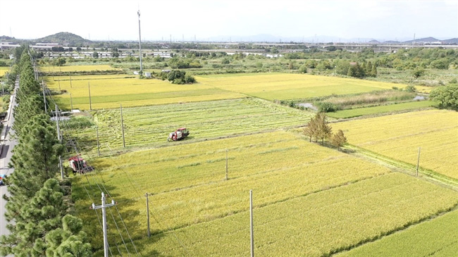 金秋時節,稻谷飄香。眼下正是稻谷收割好時節,湖州南太湖新區楊家埠街道和橋村的田野一片金黃,黃澄澄的稻田里,收割機正不停地收割稻谷,呈現出一派喜人的豐收景象。(南風、楊迪)