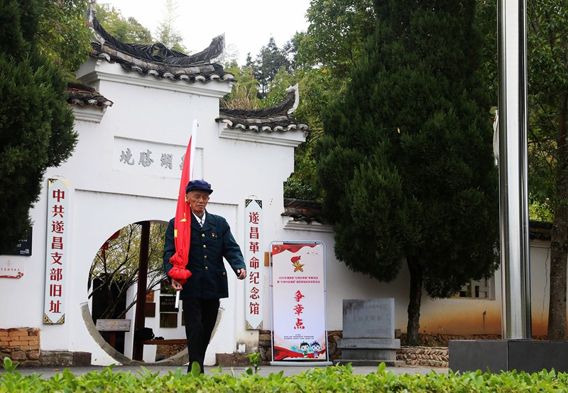 一位滿頭白發的老人獨自拿著一面五星紅旗,緩緩走向旗桿,再小心翼翼地將其系在旗桿上,然后站直身體,把國旗用力向外一拋;隨著國旗緩緩升起,老人哼唱起國歌;待國旗升至頂端,他綁好旗繩,轉身立正,仰望國旗,行注目禮……如此場景,每天清晨7點半,都會在麗水市遂昌革命紀念館前的小廣場上演。