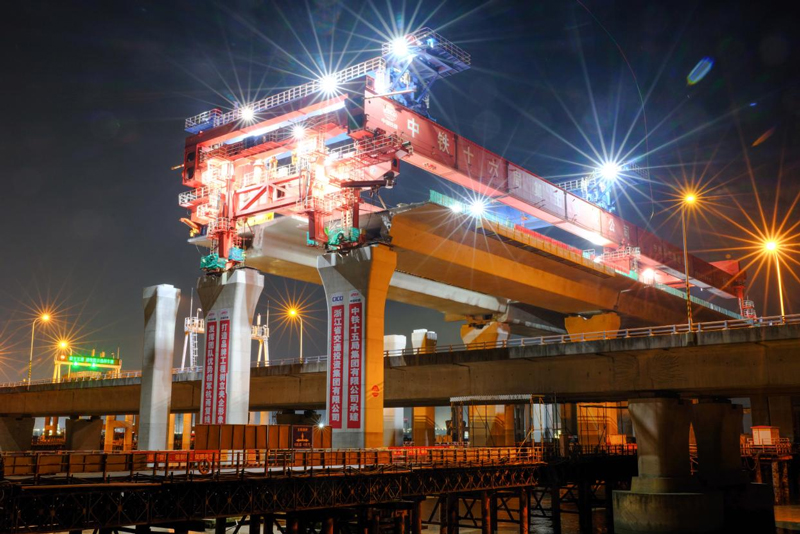 11月3日凌晨,在浙江交通集團杭甬復線寧波一期項目的施工現場,一片長50米、重達1800噸的整孔箱梁在運梁車和架梁機的密切配合下,被穩穩地放置在金塘大橋的兩側橋墩上,標志著目前在建的亞洲最大海上互通——濱?;ネㄖ骶€橋順利完成上跨金塘大橋架梁施工,為項目全線貫通奠定堅實基礎。