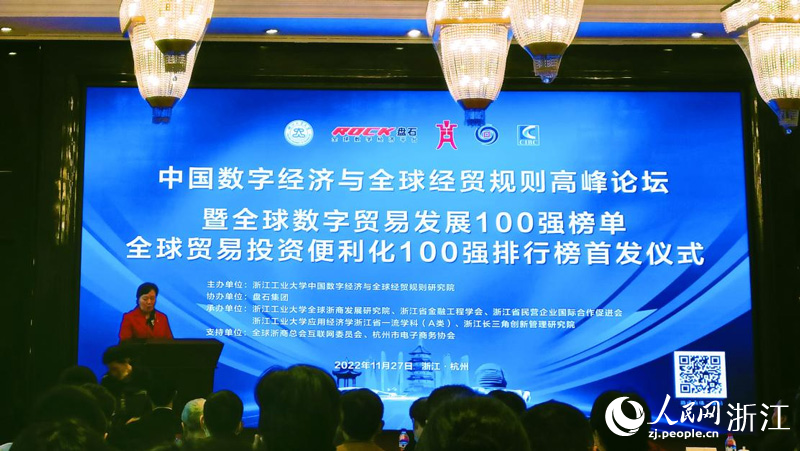 人民網杭州11月27日電 (康夢琦)今天下午,中國數字經濟與全球經貿規則高峰論壇暨全球數字貿易發展100強榜單和全球貿易投資便利化100強排行榜首發儀式在杭州舉行。此次論壇旨在加快數字經濟與數字貿易的協同發展,并對提高數字貿易規則治理話語權、建設貿易強國等議題進行討論。