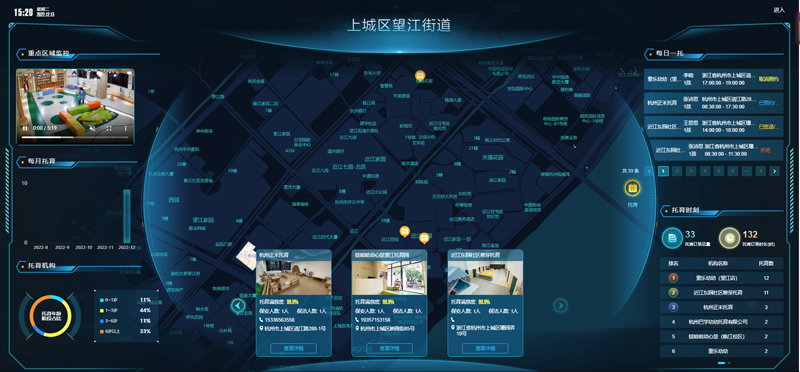 街道創新開發了“智匯望江”“碎片化”托育系統,有效整合起入園辦理、實時看護、線上結算等10余項可定制的托育服務內容。同時搭建“碎片托育駕駛艙”,涵蓋監控、托育年齡段占比、托育機構信息、每日托育訂單等20余項內容,實現數據分析、統計與決策的智能化,保障街道對整體“碎片化”托育的精準定位與研判。