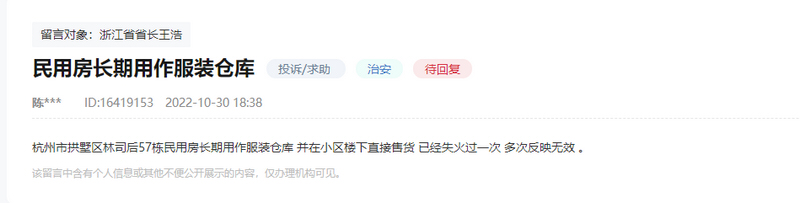 “我租住的57幢民用房一樓住宅長期被一服裝商戶作為倉庫使用。2021年春天,一次打雷將堆放在樓道口的包裝袋引燃,火勢蔓延到二樓,消防部門曾去救火?!鼻安痪?,一名網友在人民網“領導留言板”留言,反映她最近遇到的“糟心事兒”。