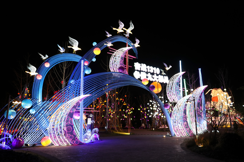 夜色漸起,在樂清市區的東運河公園里,綿延3公里的璀璨花燈絢爛奪目,整條風景線流光溢彩、耀目綻放,絡繹不絕的游客前來觀賞。本場燈會共有七組大型彩燈、四十余個點位,以樂清人文底色做串聯,用燈詮釋“樂音清揚”,打造全景沉浸體驗式燈會。1月23日,正月初二的夜晚,東運河公園還上演了無人機矩陣表演,在空中變幻出“我愛樂清”“大展鴻兔”等字樣,引得現場觀眾紛紛拍照留念?!暗谝淮维F場看無人機矩陣表演,感覺既壯觀又有趣?!庇慰蛧琅坑^賞完表演后感慨道。