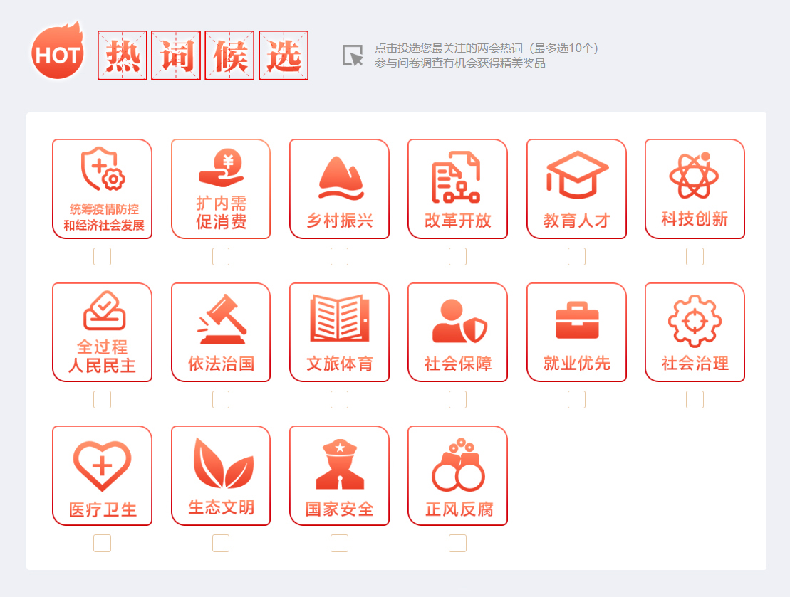 2、選擇您關注的熱詞(最多不超過10個)進行投票并回答調查問卷,參與答題越多、獲獎概率越大。
