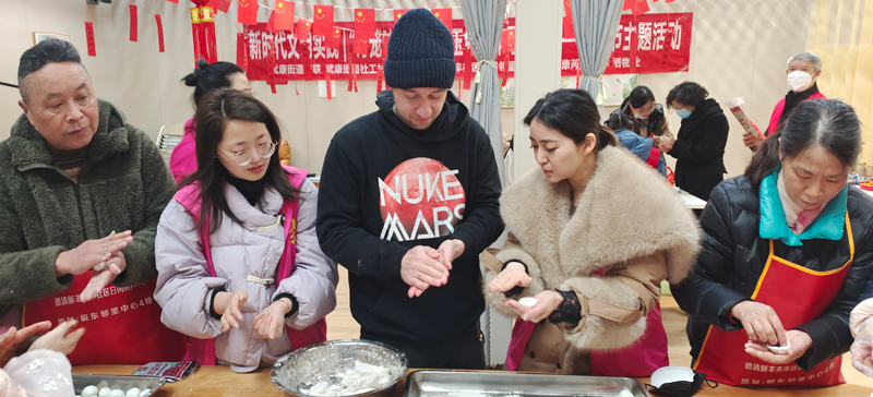 來自澳大利亞的外國友人與社區居民、青少年共同參與制作湯圓?!拔淇蛋⒔恪眰冮_始揉面、拌餡、搓湯圓,一邊嫻熟地做著豆沙餡的湯圓,一邊還手把手教外國友人?!疤腥ち?,中國傳統文化太有魅力了?!痹诘虑迥惩鈬Z學校工作的外教老師第一次體驗包湯圓。不一會兒,包好的湯圓逐漸擺滿桌面。