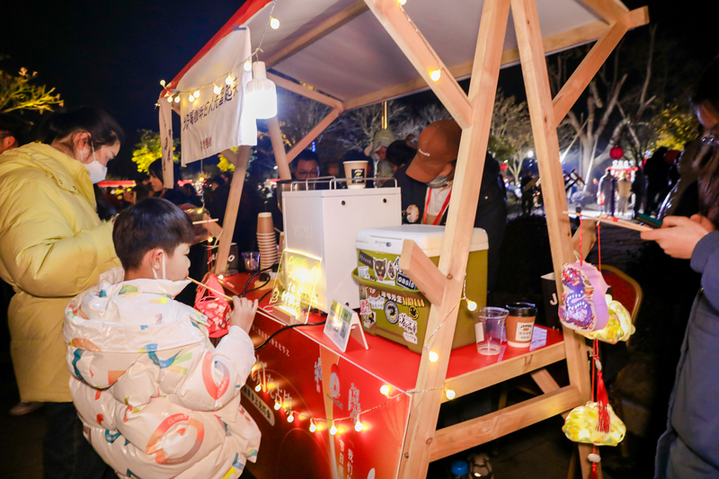 現場,兔子燈、魚燈、走馬燈等款式各異的花燈被掛上了枝頭,在月色下顯得格外俏麗,引來了不少村民打卡拍照。在梅溪鎮曉墅社區文化禮堂的戲臺上,京劇、越劇、黃梅戲等戲曲劇種輪番進行現場演藝。戲臺下,湯包、撈面、魚丸等特色美食吸引著美食愛好者駐足品嘗。另一邊的連廊內,小朋友們扯下燈謎小卡片,興沖沖地到服務點兌換花燈禮品。