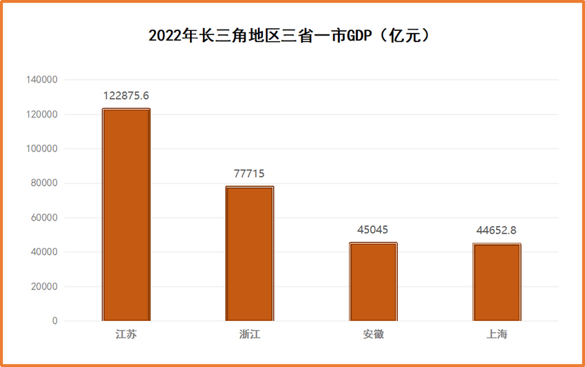 2022年度雖受疫情影響,但從發布的數據也可以看出長三角具有較強的抗風險性。上海、江蘇、浙江和安徽的生產總值分別是44652.8億元、122875.6億元、77715億元和45045億元。長三角GDP總量依然領跑全國城市群。