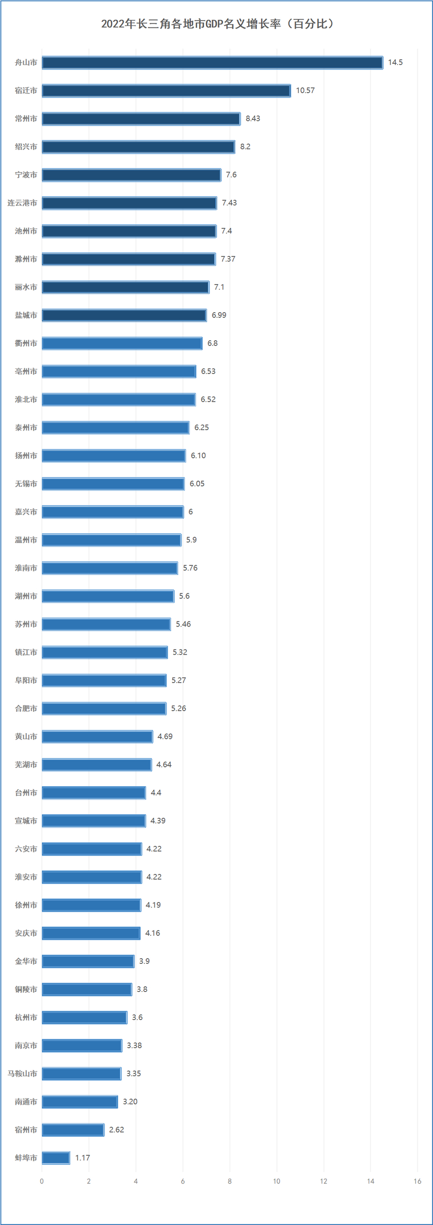 2022年長三角各地市GDP名義增長率排名中,舟山市、宿遷市、常州市位列前三甲。