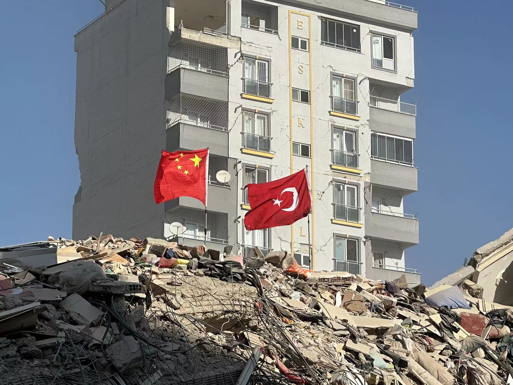 廢墟上的五星紅旗。貴興救援隊供圖