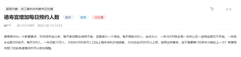 人民網杭州3月7日電 (方彭依夢)“德壽宮作為一個新晉景點,對市民開放以來,每天參觀群眾絡繹不絕,但是偌大一個場地,每天限制500人,豈非太少?!苯?,有網友在人民網“領導留言板”留言,反映參觀德壽宮預約難的問題。