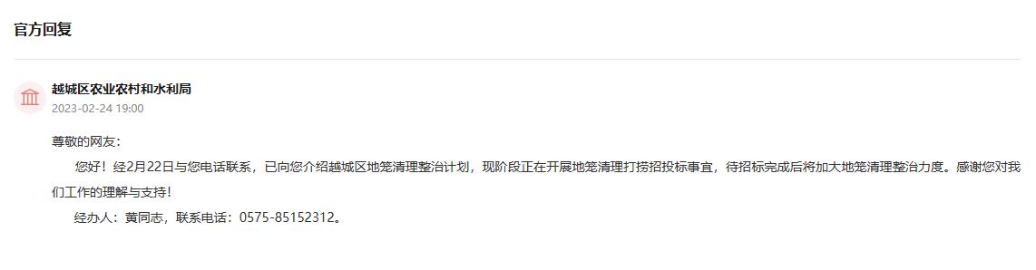 接到網友留言后,浙江省紹興市越城區農業農村和水利局在回復中明確表示,“正在開展地籠清理打撈招投標事宜,待招標完成后將加大地籠清理整治力度?!?/p>