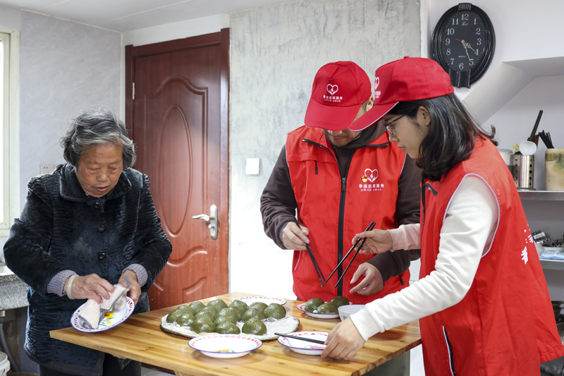 “香溢”志愿服務隊隊員與芹溪村村民一起分裝蒸好的青團。楊維靜攝