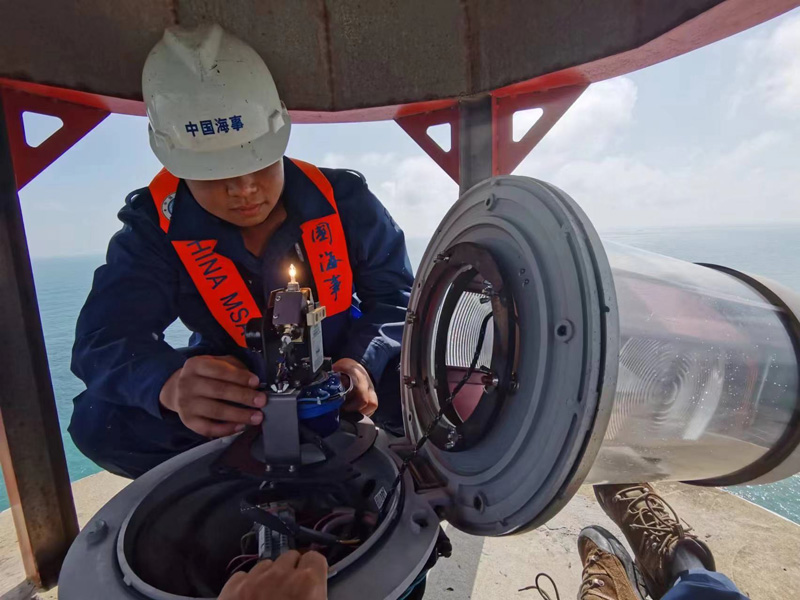 工作人員對設備進行檢測,保障群眾“五一”出行安全。寧波航標處供圖