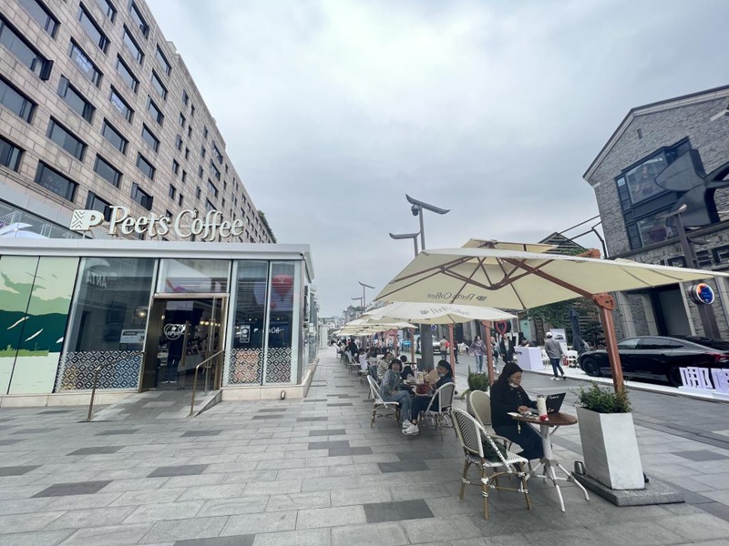 漫步在湖濱步行街,走幾步就能看到一家咖啡店,且不少店鋪都設置了商業“外擺”。當時尚又前衛的咖啡店門前放下桌椅撐起遮陽傘時,一片舒適又接地氣的消費氛圍就出現了,在春風恣意陽光燦爛的日子里,走過路過都會忍不住想坐下來。沿街不少品牌更是吸引了大量消費者,天氣好,即便是工作日,“外擺”區域依舊熱鬧。