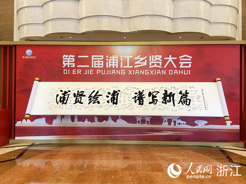 “浦江是我的家鄉,雖然身在異地,但我時刻關注著家鄉的發展?!?月30日,浦江縣仙華國際會議中心大廳熱鬧非凡,來自五湖四海的鄉賢,陸續前來報到。在本屆鄉賢大會的報到環節,每位鄉賢都收到了一個刻有自己名字的印章。報到現場,在一幅“浦賢繪浦,譜寫新篇”的書畫作品上,鄉賢們簽名并蓋上自己的印章。