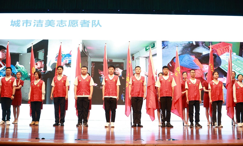 大會現場,文明行為勸導志愿者隊、安全生產企業志愿者隊等10支白楊十大專項行動志愿者隊伍接受街道授旗。白楊街道供圖