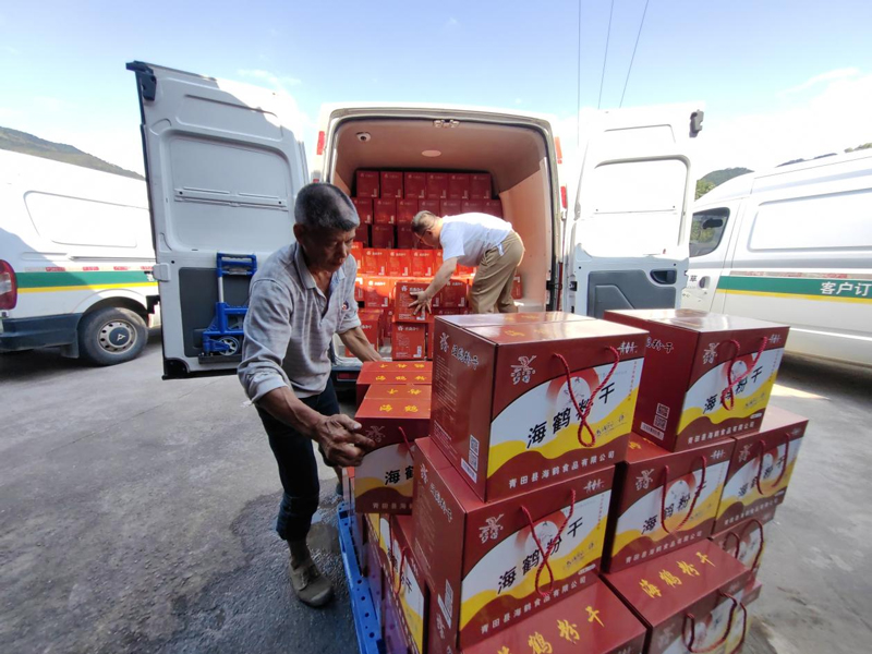 工作人員與農民共同將海溪粉干搬上返程送貨車。青田煙草供圖