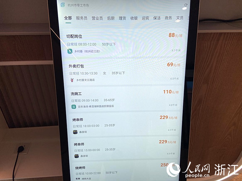 湖濱是杭州商貿和旅游的中心,雖然面積只有1.6平方公里,但擁有3000余家單位,聚集了大商場、大醫院和各類服務業企業。據了解,湖濱步行街工作日的日均人流量約9萬人次,周末日均人流量約16萬人次,零工的缺口在1000人左右。在杭州市上城區人社局的指導下,湖濱街道成立了“零工市場”專班,首個零工市場服務崗亭于3月底建成,4月份推廣使用。