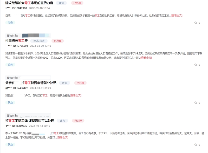 人民網“領導留言板”上關于“打零工”的各類求助、建言。人民網“領導留言板”截圖
