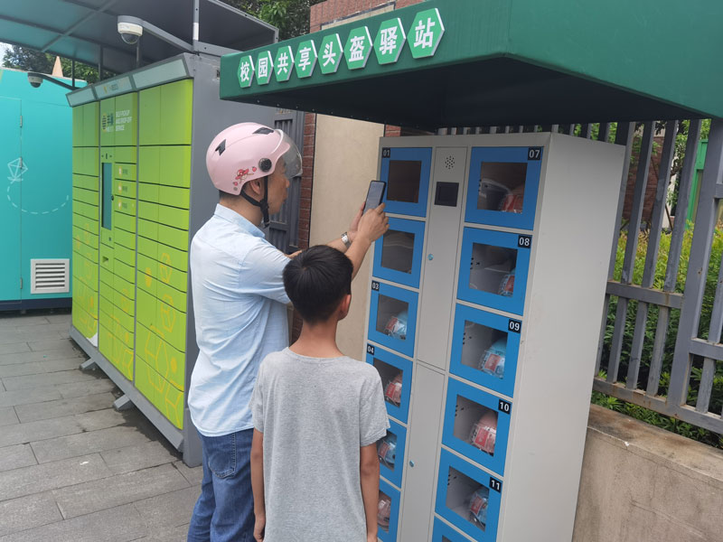 該驛站設有12個小柜子,每個小柜子內都放有一頂“校園共享頭盔”。家長接孩子時若忘記帶孩子的頭盔,只要用手機掃描柜機屏幕上的二維碼,并在物品租賃欄點擊借出項目,就可以打開選取的柜門拿到頭盔。歸還時,掃碼打開柜門,放入頭盔即可。為了保證頭盔的衛生、清潔,學校還會及時對歸還的頭盔進行清潔和消毒。