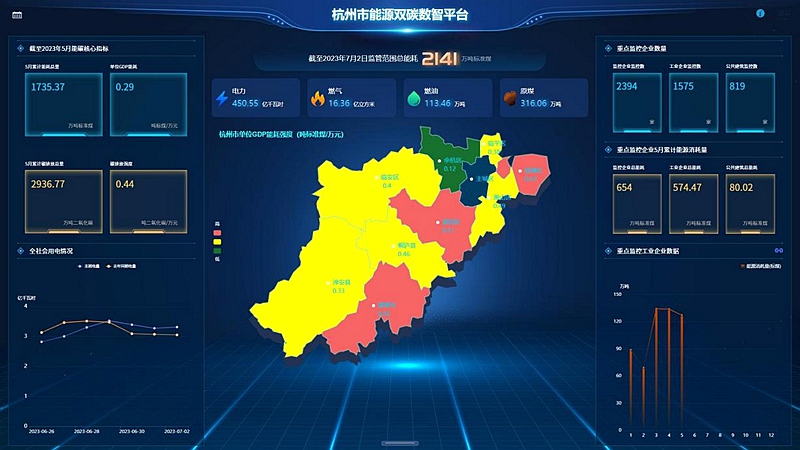 如今,在夏季的用電高峰期,相關部門通過“杭州市能源雙碳數智平臺”每日采集的能源電力消耗數據,還可對高耗能企業的能源消耗實行預算化管理,并通過平臺跟蹤其用能量、碳排放量、能碳強度等多個監管參數,在實現動態監管的同時,也幫助企業提前安排生產負荷,避免倉促限產,更好地實現能碳管控要求與企業發展之間的平衡。
