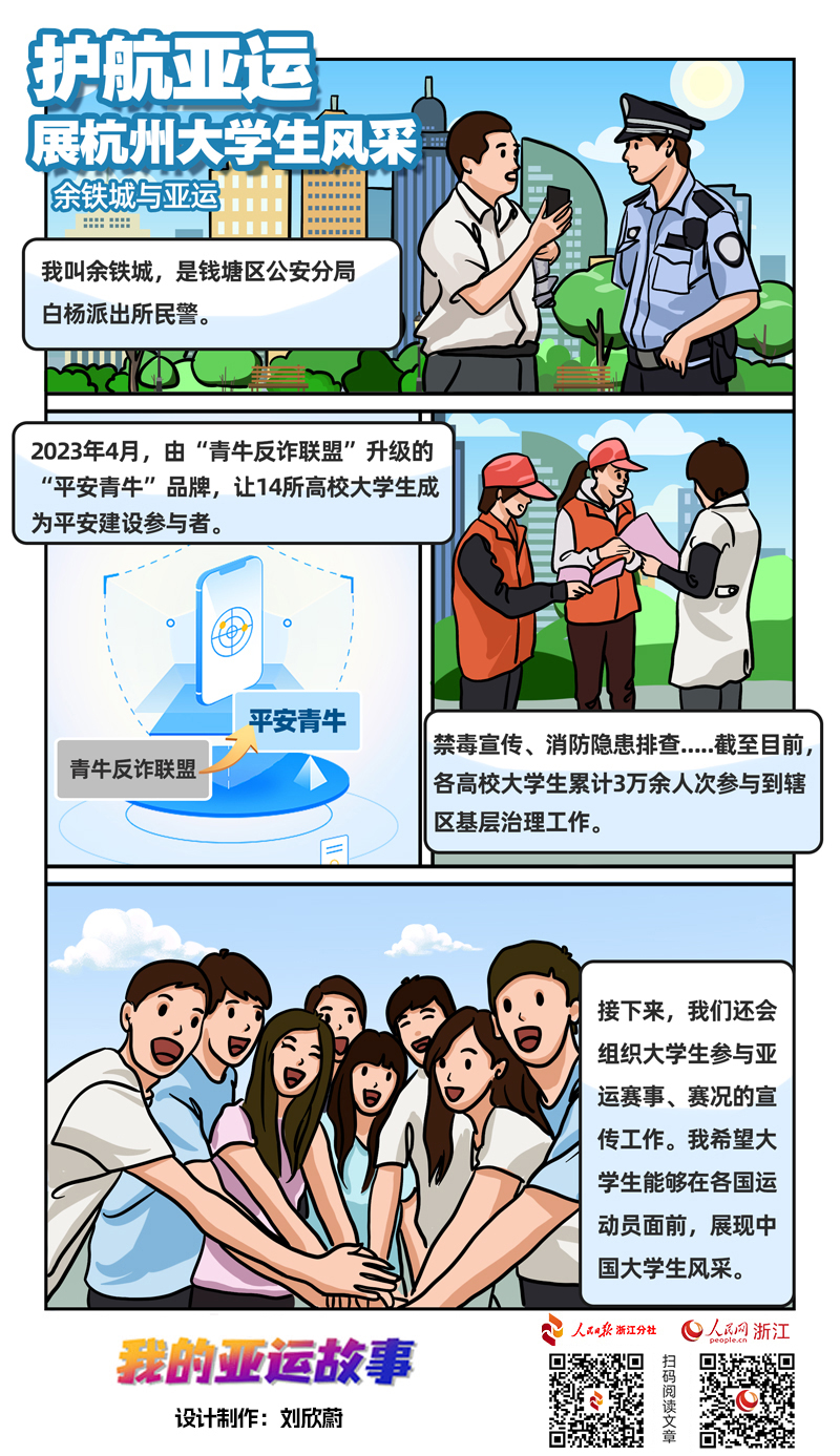 “大學生從反詐騙宣傳對象搖身一變成為‘護航亞運’平安建設的志愿者?!焙贾蒎X塘區公安分局白楊派出所民警余鐵城介紹,為凈化網絡空間,錢塘區公安分局聯合轄區14所高校成立了“青牛反詐聯盟”。2023年4月,“青牛反詐聯盟”品牌升級為“平安青?!逼放?,將大學生吸納成為平安建設參與者,參與基層治理。
