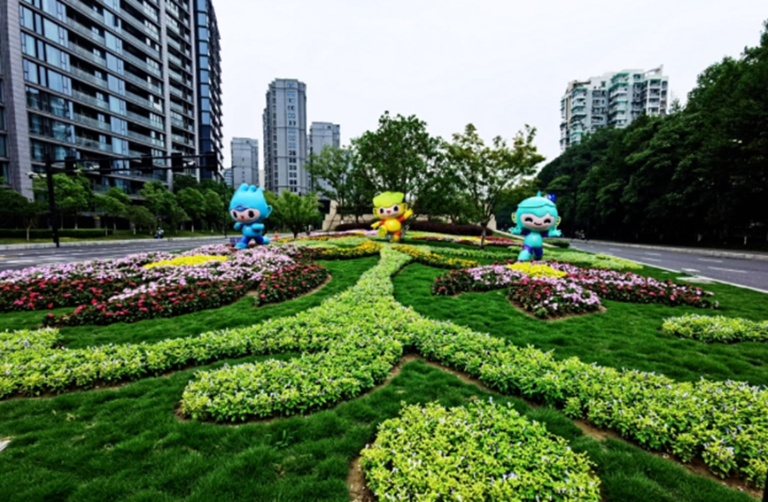 走在上城區,鮮花綠植隨處可見。之江路以橙色、紅色為主調色彩,布置繽紛花帶;望江東路隧道口上方的模紋花壇利用不同色彩的花卉植物組成荷花的花朵和藤蔓的圖案,彰顯杭州亞運會的獨特韻味;火車東站廣場運用大色塊布局與零星擺放相結合的手法,通過三角梅、鳳仙花、牽?;?、海棠花等花卉植物的布置,為火車站增添一道亮麗的風景……據統計,2023年年初以來,上城區在重要道路、場館周邊、交通場站等重要流線、節點布置了綠化景觀,完成21條道路綠化景觀提升,累計種植時花約5萬平方米。