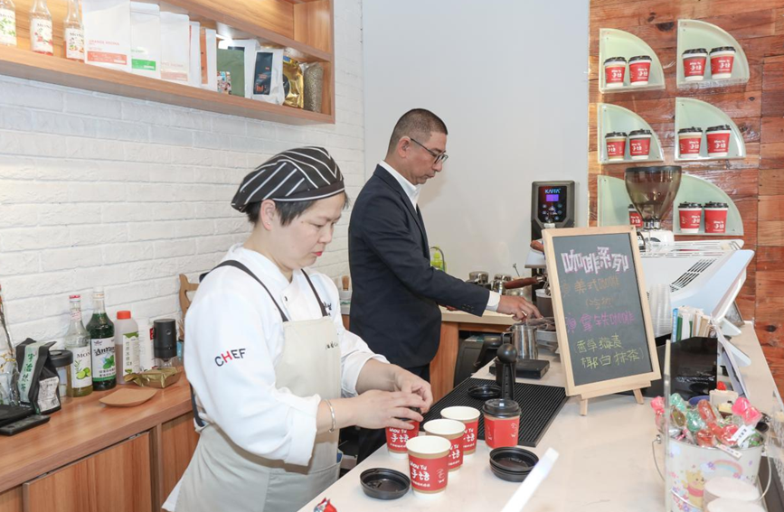 “您好,您的咖啡做好了,請品嘗?!薄昂蔀场づА眱?,聽障人士吳靜霞用手熟練地表達,顧客們也用手語道謝。
