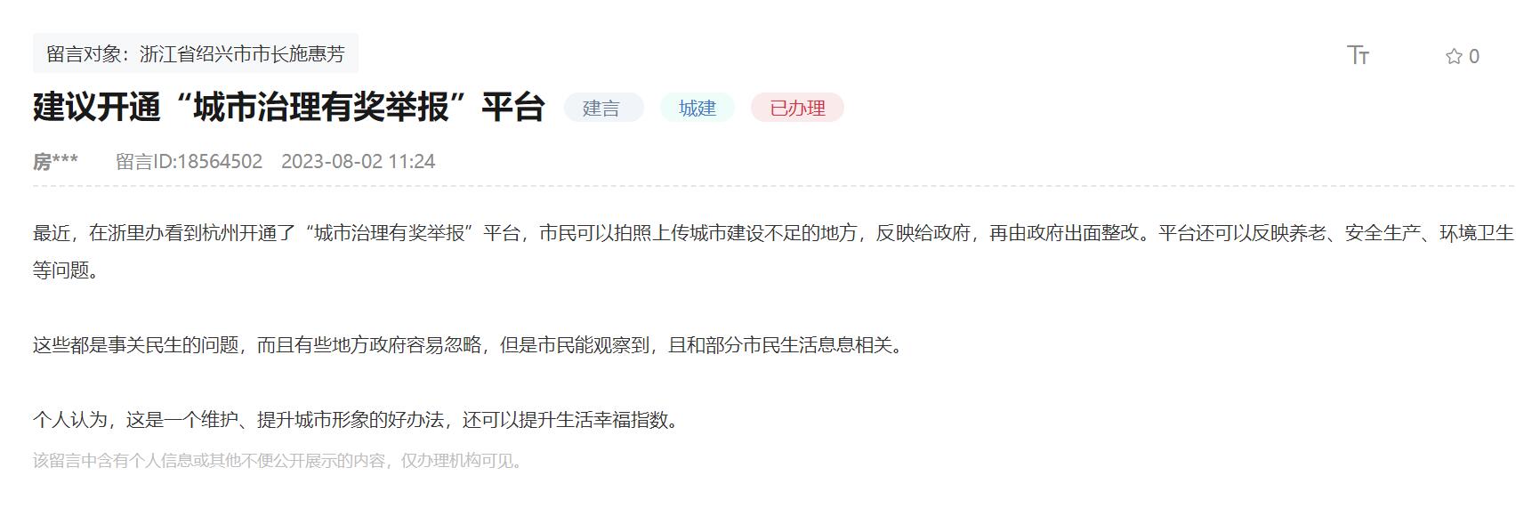 人民網杭州8月31日電 (記者張麗瑋)“在浙里辦看到杭州開通了‘城市治理有獎舉報’平臺……這是一個維護、提升城市形象的好辦法……”最近,紹興網友李先生在人民網“領導留言板”提出建議,希望紹興開通類似“城市治理有獎舉報”平臺,市民可以將地方政府容易忽略的民生問題,通過拍照在線上反映。