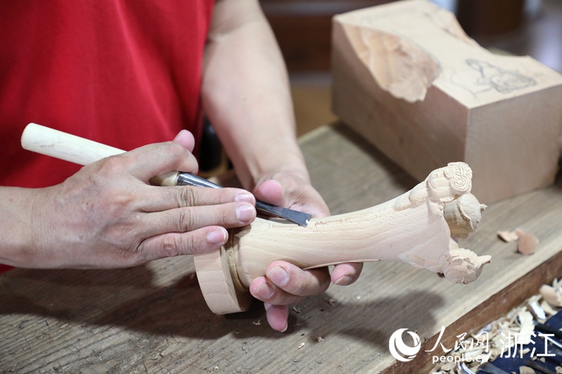 國家級非遺東陽木雕代表性傳承人黃小明手捧杭州亞運會頒獎花束花器部分(過程版)。人民網 方彭依夢攝