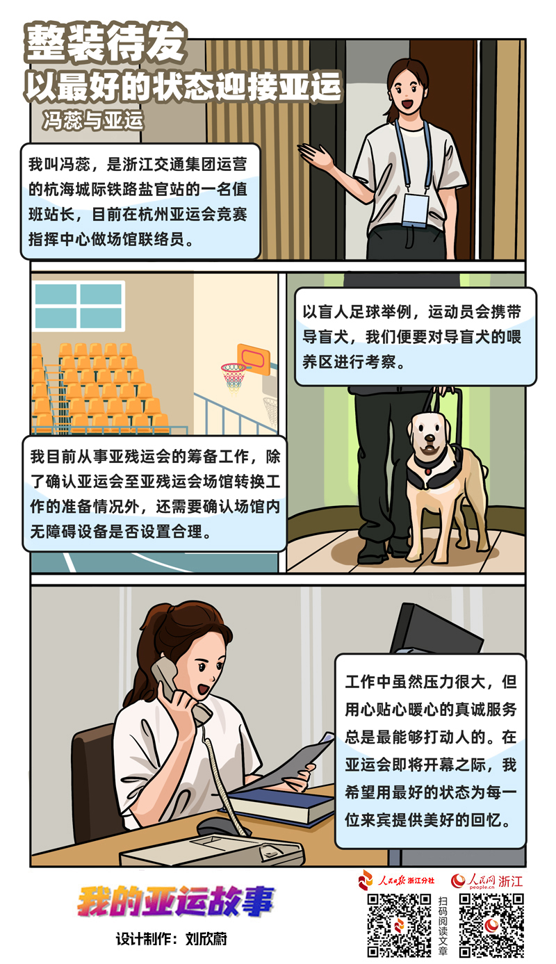 “我近期的工作重點還是亞殘運會的籌備,對19個亞殘運會場館進行現場考察?!瘪T蕊說,除了確認場館亞運會至亞殘運會轉期工作準備情況外,她還需要反復確認場館內無障礙設備是否設置合理、運動員的流線是否清晰,“就拿盲人足球舉例,運動員會攜帶導盲犬。我們要對導盲犬的喂養區進行考察?!?/p>