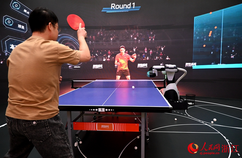 在杭州濱江,市民正在和AI“許昕”進行乒乓球PK賽。人民網記者 張麗瑋攝