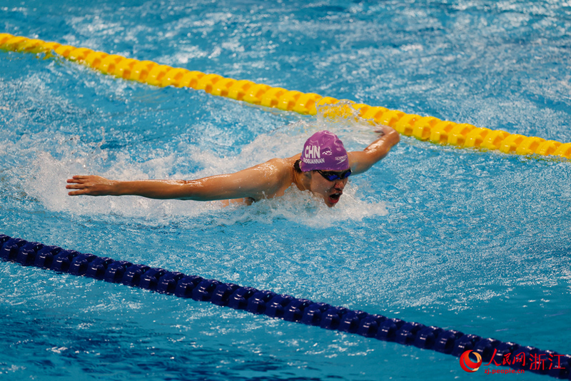 亞運會男子200米混合泳決賽上,中國選手陶冠男正在奮力拼搏。人民網 陳陸洵攝