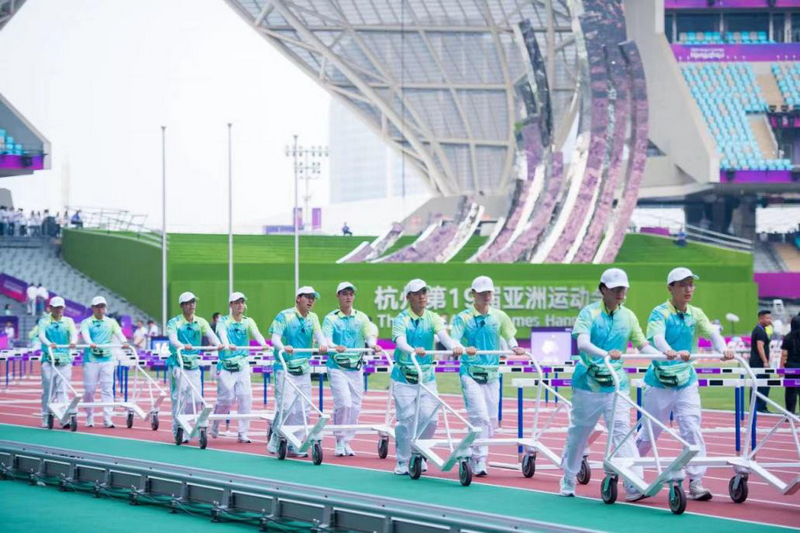 田徑賽場上,亞運會志愿者正在擺放跨欄欄架。杭州亞組委供圖