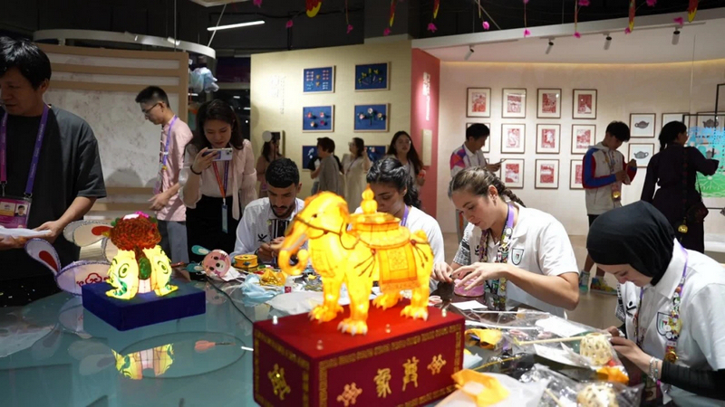 中秋之夜,在亞運村內,各國運動員正在體驗中國傳統民俗文化。杭州亞組委供圖