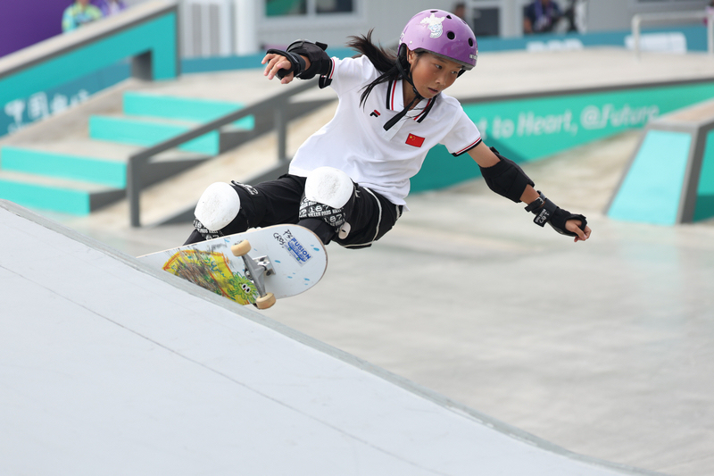 9月26日,滑板項目女子街式決賽,中國代表團選手崔宸曦在比賽中。杭州亞組委供圖