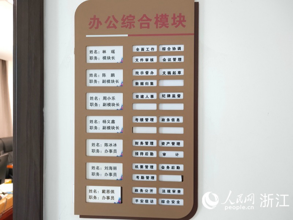 在龍港市經濟發展局,門牌上不見“科室”,取而代之的是各類“模塊”。人民網 劉欣蔚攝