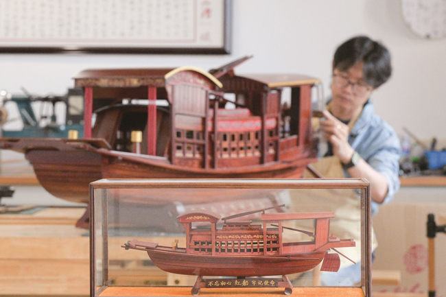 6月30日,在嘉興市南湖區余新鎮普光村,錛鑿斧鋸的聲音從一間工作室內傳出,嘉興市文化特派員汪抑凡正專注地雕刻南湖紅船船模,一艘即將完工的船模在燈光下泛著溫潤的光澤。(俞中岳)