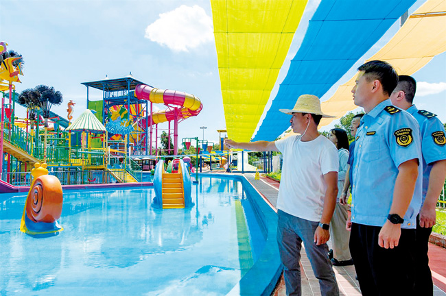 7月4日,金華蘭溪市市場監管局特種設備科工作人員對該市一處水上樂園進行開放前的安全檢查。為確保游樂設施的暑期安全運行,連日來,檢查人員對該市相關場地、設施開展全面檢查服務,筑牢安全防線。(胡肖飛)