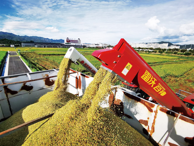 7月7日下午,在金華東陽市畫水鎮正偉農場的稻田里,收割機作業后,農民們將稻谷通過輸送管直接裝入路邊等候的運輸車中,車廂內很快堆起小山般的谷堆?!敖衲暝绲酒焚|好,顆粒飽滿,畝產超400公斤?!闭齻マr場負責人蔣健說。