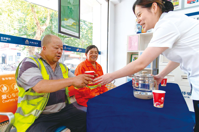 7月7日,在金華市婺城區城東街道青春社區一家銀行網點清涼驛站,工作人員為環衛工人遞上止渴消暑的涼茶。