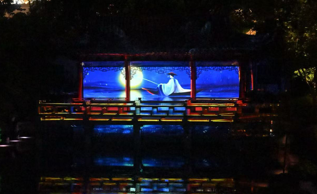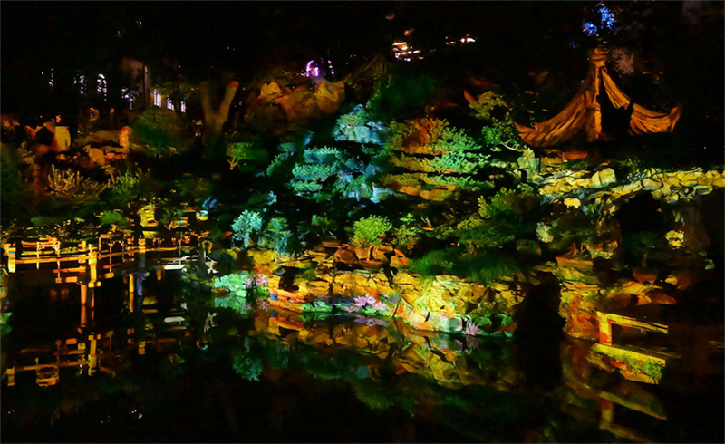 項目選取館藏書畫精品,通過燈光點亮、動態投影、Mapping show、裝置互動等形式,讓文物“活”起來。游客沿350米動線漫步,可穿越“物境、情境、意境”三大篇章,在大假山、九獅軒、玉玲瓏等24處景觀中感受“一步一景一畫卷,移步換景畫中游”的東方美學。