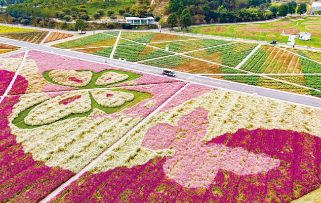 10月26日,金華市武義縣王宅鎮花田美地景區,波斯菊、千日紅、百日草、玫瑰等各種鮮花競相綻放,猶如一塊塊巨大的花毯,色彩斑斕、美不勝收,游客穿行于五彩繽紛的花海中賞景游玩,樂享金秋美麗景色。(時寬兵)